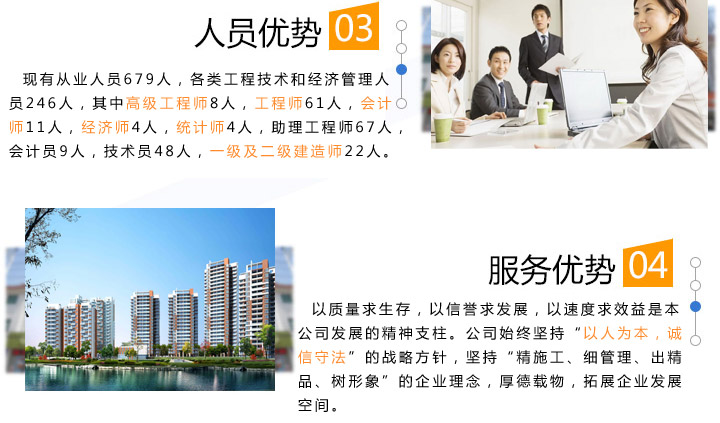 質量求生存,以信譽求發(fā)展,以速度求效益是本公司發(fā)展的精神支柱。公司始終堅持“以人為本,誠信守法”的戰(zhàn)略方針,堅持“精施工、細管理、出精品、樹形象”的企業(yè)理念,厚德載物,拓展企業(yè)發(fā)展空間。
